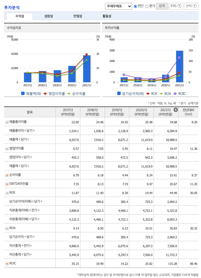 ROA(Return On Assets, 총자산순이익율, 경영자의 관점) : 2017년 약 9%, 2018년 약 8%, 2019년 약 6%, 2020년 약 10%, 2021년 약 30%이고, 자기자본순이익율은 이상율(10%)보다 높습니다.