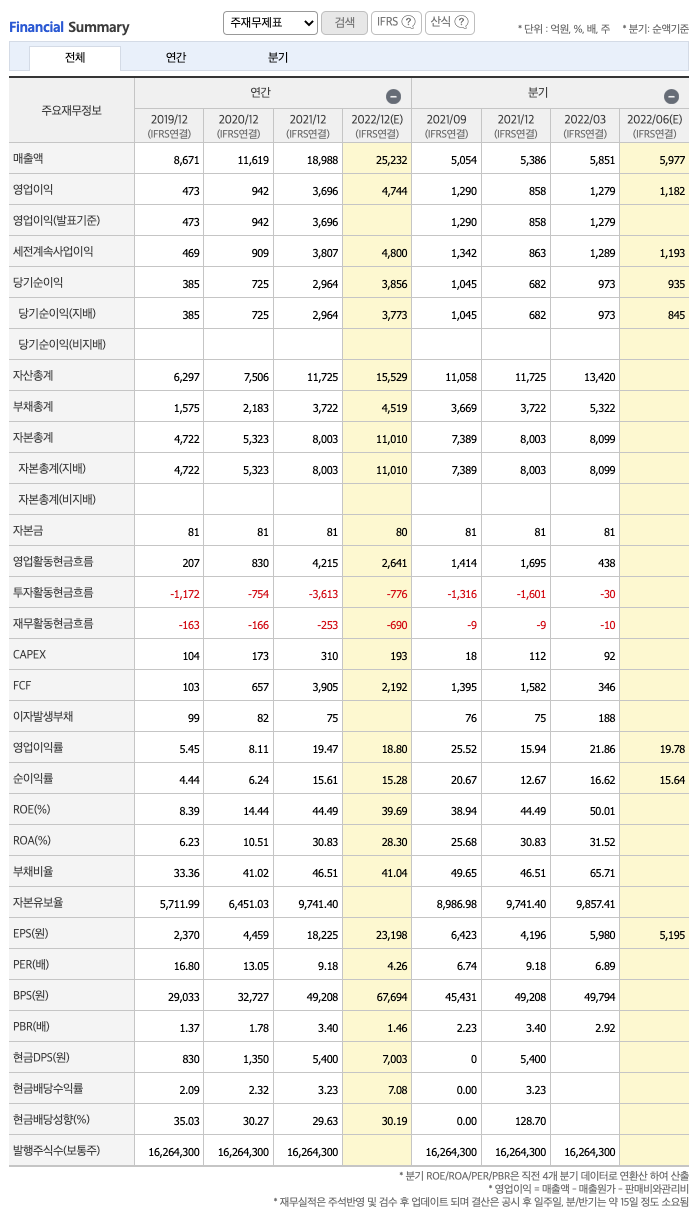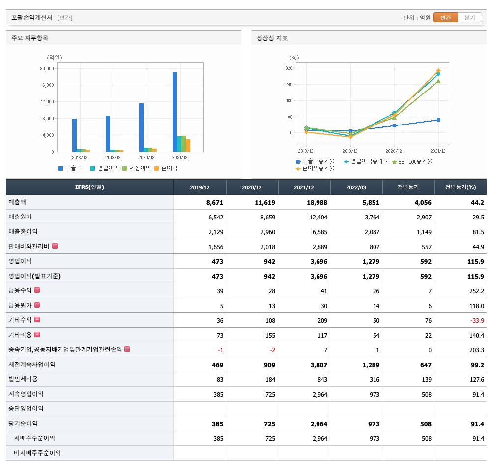 매출액 : 2019년 8671억원, 2020년 11619억원, 2021년 18988억원, 2022년 1분기 5851억원으로 전년동기대비 증가하였습니다. 2022년 1분기는 전년동기대비 44.2% 증가하였습니다. 2021년 분기별로 보면 2분기 4493억원, 3분기 5054억원, 4분기 5386억원, 2022년 1분기 4056억원입니다.