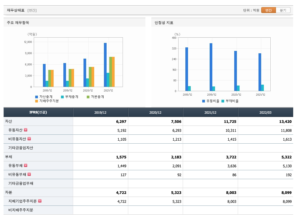 영업활동 현금흐름 : 2019년 207억원, 2020년 830억원, 2021년 4215억원, 2022년 1분기 438억원으로 영업활동 현금흐름이 원활합니다.