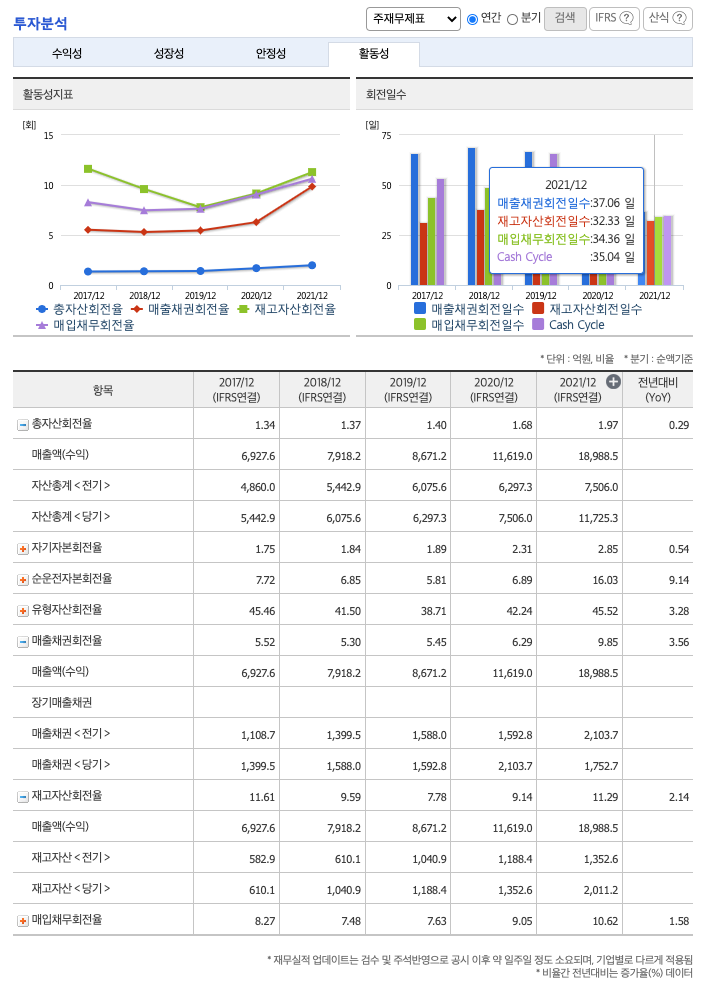 매출채권회전율(높을 수록 좋습니다) : 2019년 약 1592억원, 2020년 약 2103억원, 2021년 약 1752억원이고, 회전율은 2019년 약 5%, 2020년 약 6%, 2021년 약 9%로 안정적입니다.