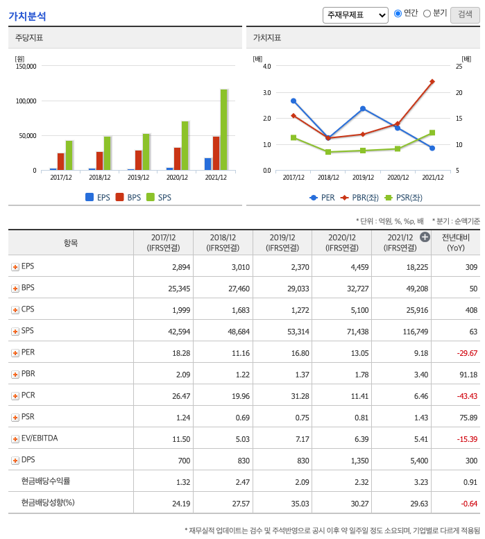 DPS(Dividend Per Share의 약자, 총배당금을 총주식발생수로 나눈 것, 한 주당 얼만큼의 배당금을 받을 수 있는지 알 수 있는 지표, DPS가 높을 수록 배당금이 많은 것임) : 2017년 700원, 2018년830원, 2019년 830원, 2020년 1350원, 2021년 5400원으로 전년동기 증가하였습니다.