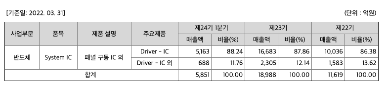 당사의 주요 제품은 패널을 구동하는 Driver-IC, Timing Controller 등이며, 주요 제품인 Driver-IC는 당분기 전체 매출액의 88.2%(전분기 87.5%)를 차지하고 있습니다. 당사의 매출 중 수출이 차지하는 비중은 당분기 기준 전체 매출액의 99.6%(전분기 98.1%) 입니다.