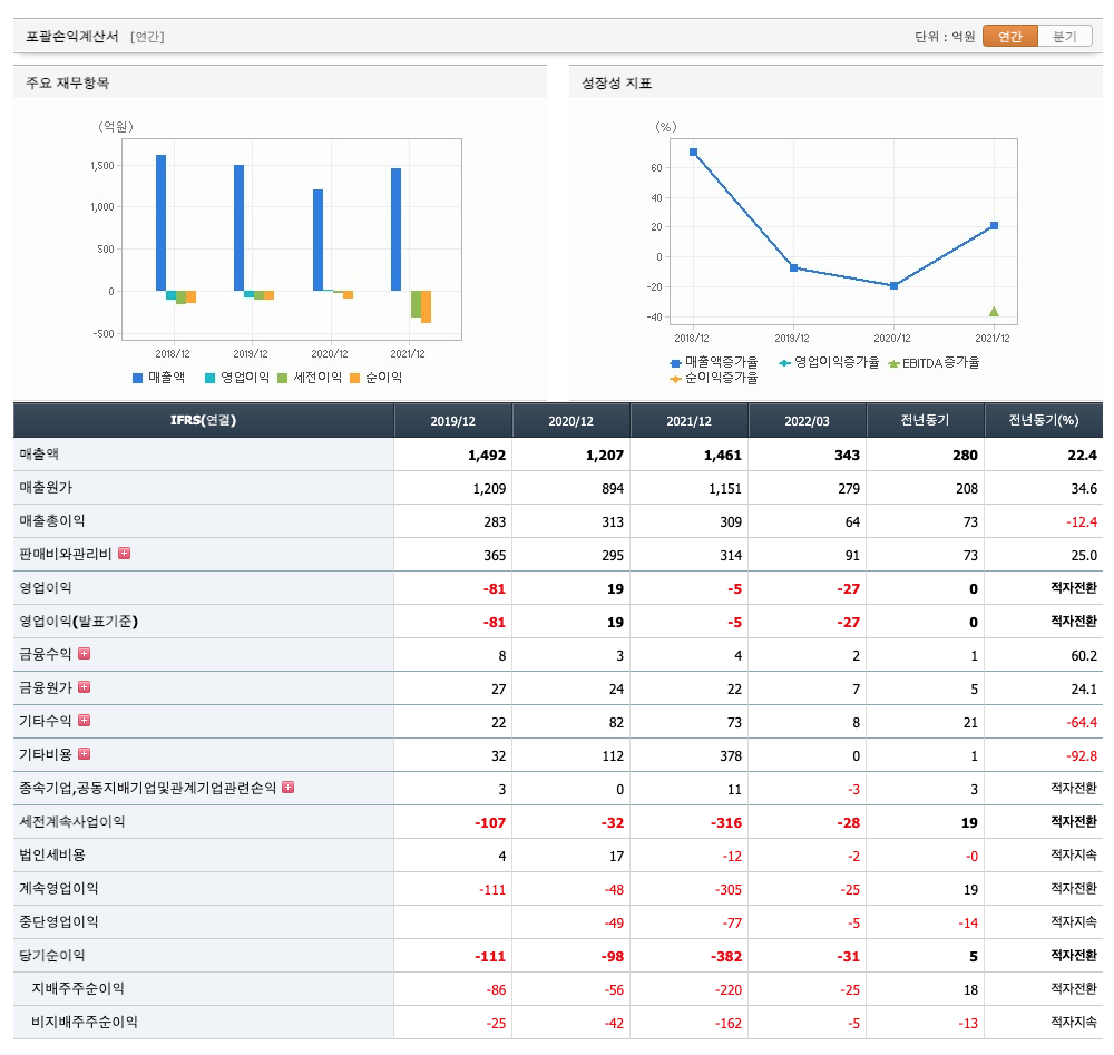 매출액 : 2019년 1492억원, 2020년 1207억원, 2021년 1461억원, 2022년 1분기 343억원으로 전년동기대비 증가하였습니다. 2022년 1분기는 전년동기대비 22.4% 증가하였습니다. 2021년 분기별로 보면 2분기 288억원, 3분기 534억원, 4분기 358억원, 2022년 1분기 343억원입니다.