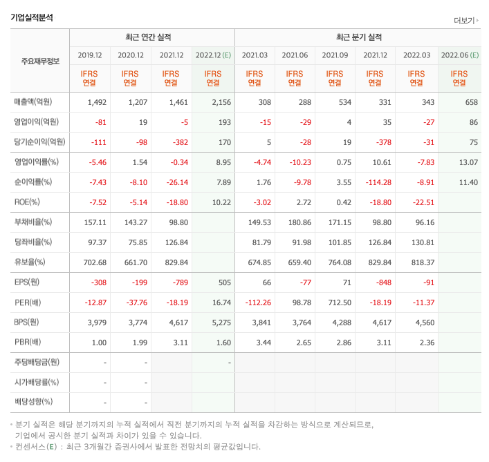 영업이익 : 2019년 -81억원, 2020년 19억원, 2021년 -5억원, 2022년 1분기 -27억원으로 전년동기대비 적자전환하였습니다. 2021년 분기별로 보면 2분기 -29억원, 3분기 4억원, 4분기 20억원, 2022년 1분기 -27억원입니다.