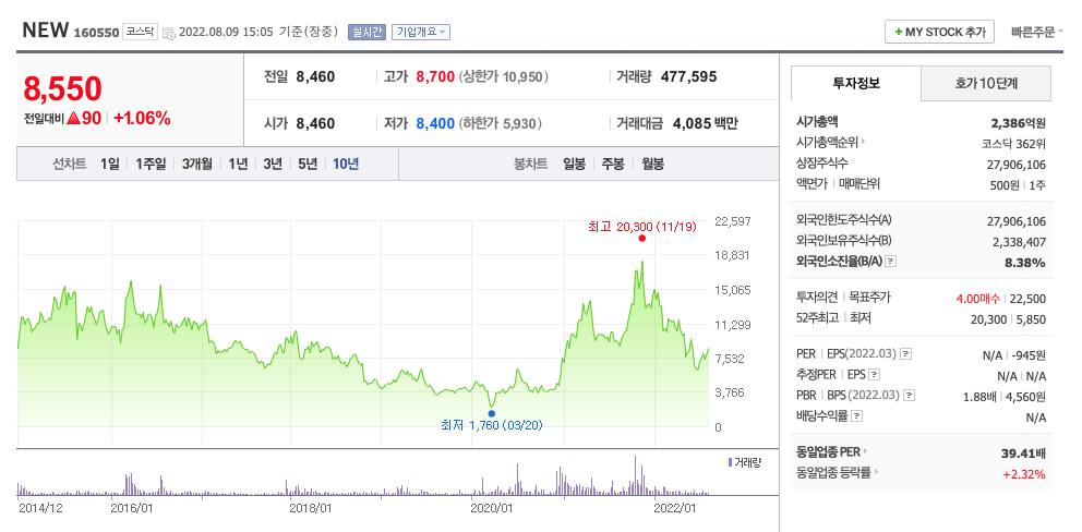 NEW의 2022년 영업이익은 193억원으로 추정됩니다. 현재(22. 8.9 ) 시가총액은 2386억원으로 멀티플 12입니다.