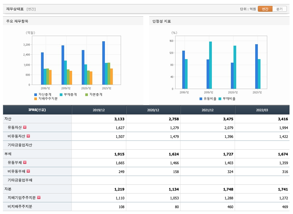 투자활동 현금흐름 : 2019년 -219억원, 2020년 -286억원, 2021년 -150억원, 2022년 1분기 185억원으로 2021년까지 영업활동 현금흐름이 원활합니다.