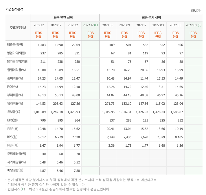 매출액 : 2019년 1483억원, 2020년 1690억원, 2021년 2004억원, 2022년 1,2분기 1157억원으로 전년동기대비 증가하였습니다. 2022년 1분기는 전년동기대비 25.9% 증가하였습니다. 2021년 분기별로 보면 3분기 501억원, 4분기 584억원, 2022년 1분기 552억원, 2분기 606억원입니다.