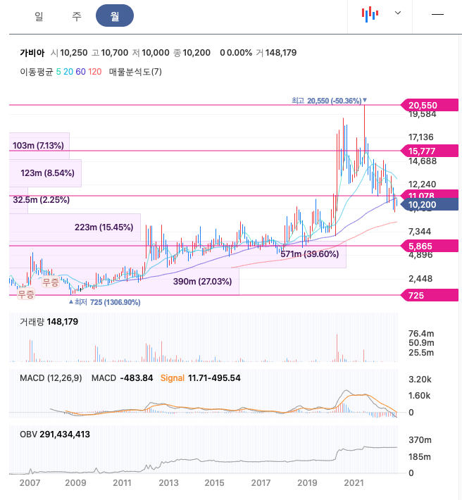 가비아의 주가는 21년 6월 급등하여 최고 20,550원을 찍은 뒤 조정을 받았습니다.
