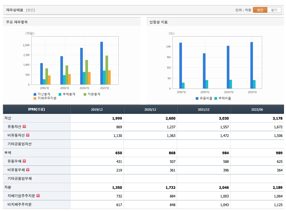 자산은 2019년 1999억원, 2020년 2600억원, 2021년 3030억원, 2022년 1,2분기 3178억원으로 증가하였습니다.