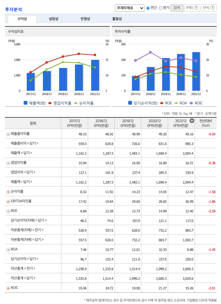 ROA(Return On Assets, 총자산순이익율, 경영자의 관점) : 2017년 약 7%, 2018년 약 10%, 2019년 약 12%, 2020년 약 10%, 2021년 약 8%이고, 자기자본순이익율은 이상율(10%)보다 낮습니다.