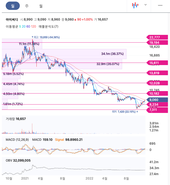 아이씨디의 주가는 2020년 11월 증가하여 21년 2월 최고 19,850원을 찍고, 조정을 받았습니다.