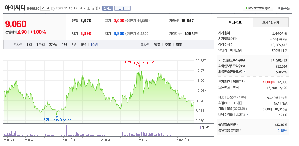 아이씨디의 2022년 영업이익은 22억원으로 추정됩니다. 현재(22. 11. 16) 시가총액은 1637억원으로 멀티플 74입니다.