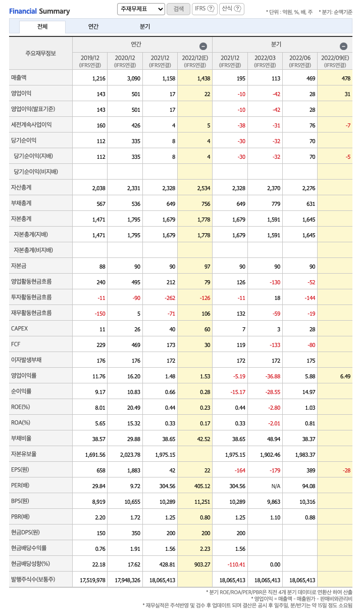 영업이익 : 2019년 143억원, 2020년 501억원, 2021년 17억원, 2022년 1분기 -14억원으로 전년동기대비 적자전환하였습니다. 2021년 분기별로 보면 3분기 -8억원, 4분기 -10억원, 2022년 1분기 -42억원, 2022년 2분기 28억원입니다.