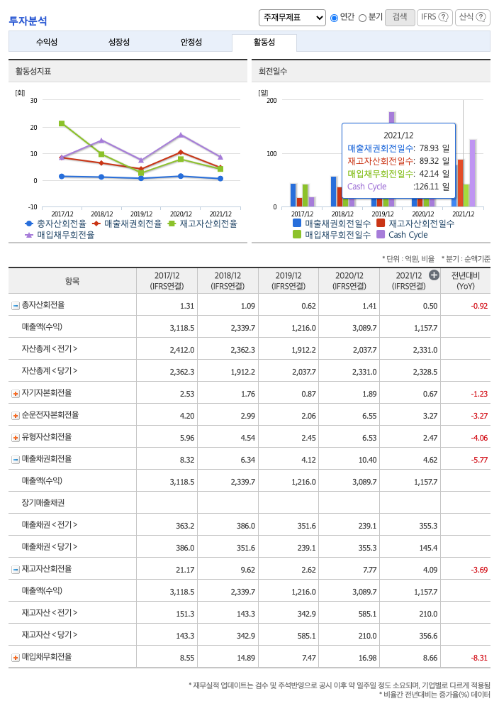 재고자산회전율(높을 수록 좋습니다) : 2019년 약 585억원, 2020년 약 210억원, 2021년 약 356억원이고, 회전율은 2019년 약 2%, 2020년 약 7%, 2021년 약 4%로 안정적입니다.