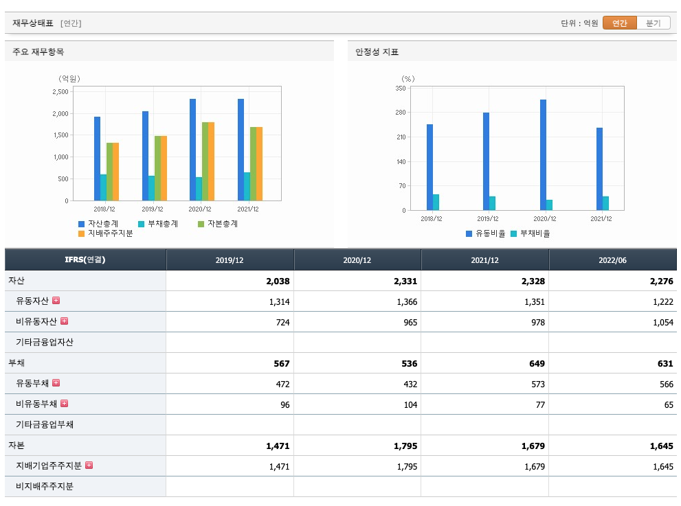 자산은 2019년 2038억원, 2020년 2331억원, 2021년 2328억원, 2022년 1,2분기 2276억원으로 감소하였습니다.