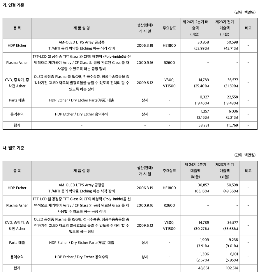 198억원이며, 그 중 주요 품목들의 연결기준 매출액 및 매출 비중은 HDP Etcher 309억원(53%), 증착기(진공물류장비) 148억원(25%), Parts 및 용역매출 125억원(22%) 입니다.