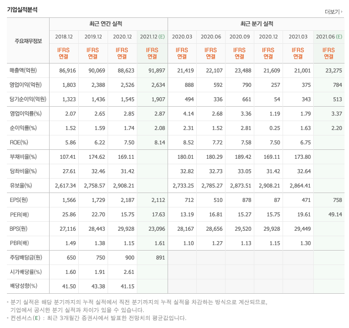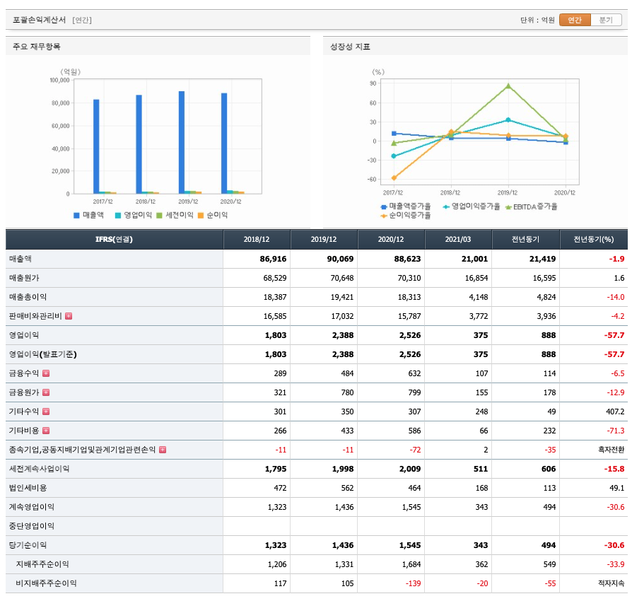 매출액 : 2018년 86,916억원, 2019년 90,069억원으로 증가하였고, 2020년 88,623억원, 2021년 1분기 21,001억원으로 감소하였습니다. 2021년 1분기는 전년동기대비 -1.9% 감소하였습니다. 2020년 분기별로 보면 2분기 22,107억원, 3분기 23,488억원, 4분기 21,609억원입니다.