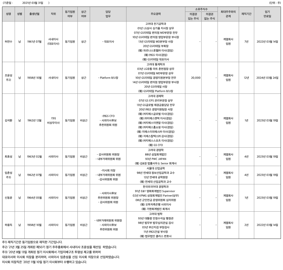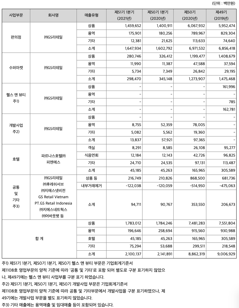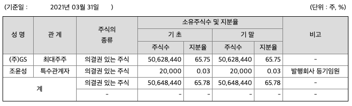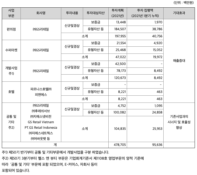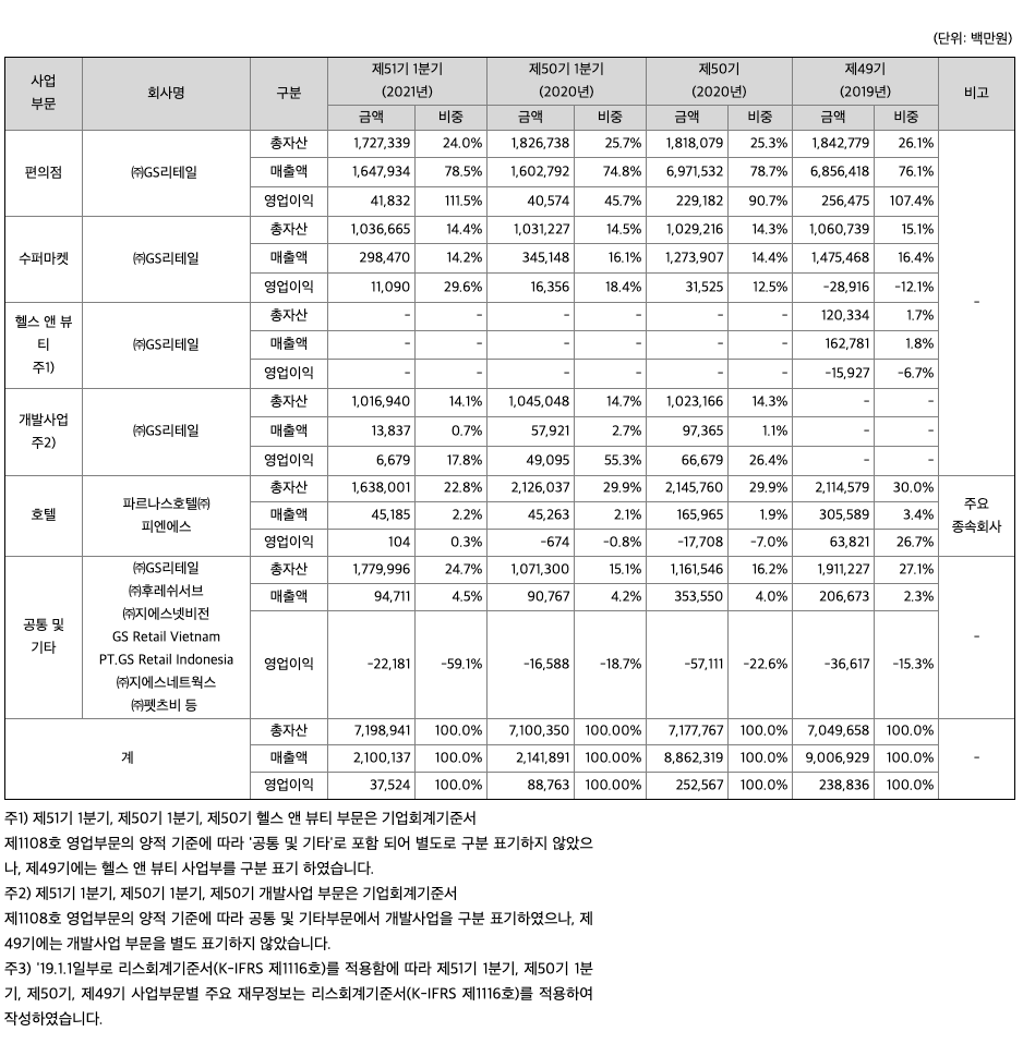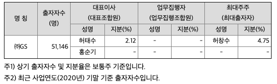 최근 반려용품 상품력 강화 및 온라인 플랫폼 구축을 위해 '18년 8월부터 (주)펫츠비에 지분 투자를 진행하였습니다. '21년 3월 (주)펫츠비는 (주)어바웃펫으로 상호를 변경하였으며, '21년 1분기말 기준 (주)어바웃펫에 대한 당사 지분율은 57.1% 입니다. 또한 다양한 플랫폼 사업 확대를 위해 '19년 1월 주차장 운영업체인 지에스파크이십사㈜ 지분 50.0%를 취득 하였습니다.