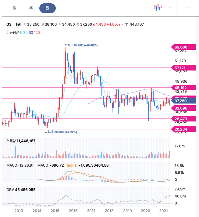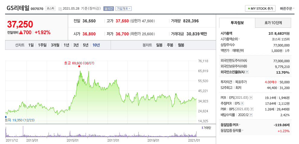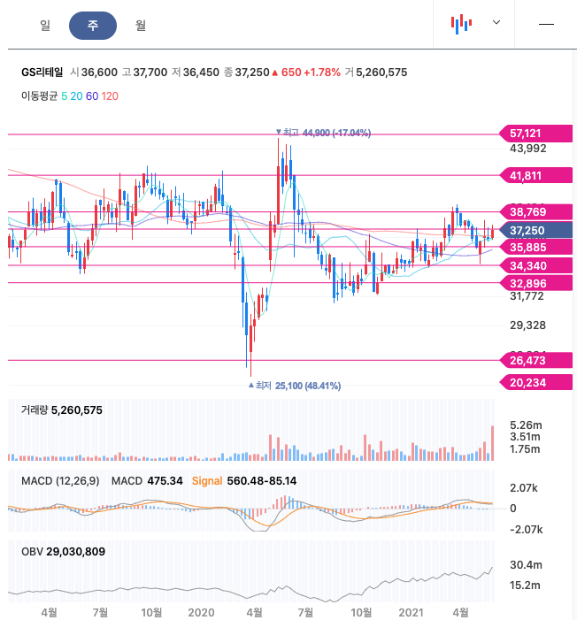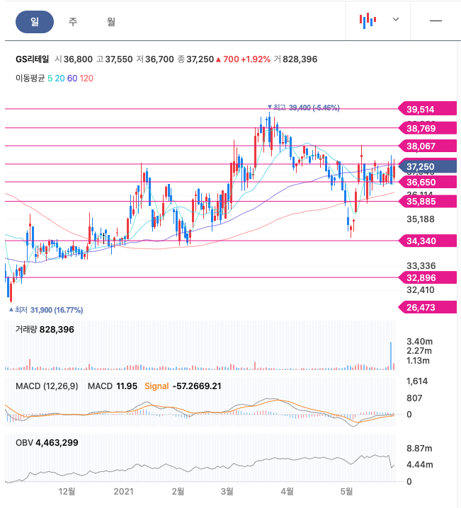 | GS리테일 | 37250원 | 37076원 | 37104원 | 37340원 |