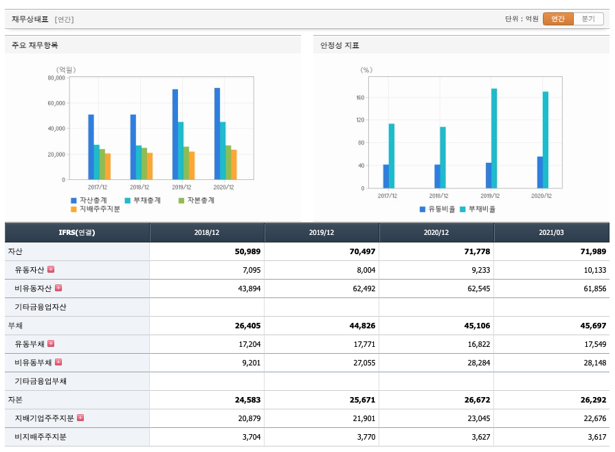 재무활동 현금흐름 : 2018년 311억원, 2019년 -5074억원, 2020년 -4362억원, 2021년 1분기 -466억원으로 2018년의 재무활동 현금흐름은 플러스이고, 2019년이후의 재무활동 현금흐름은 마이너스로 원활합니다.
