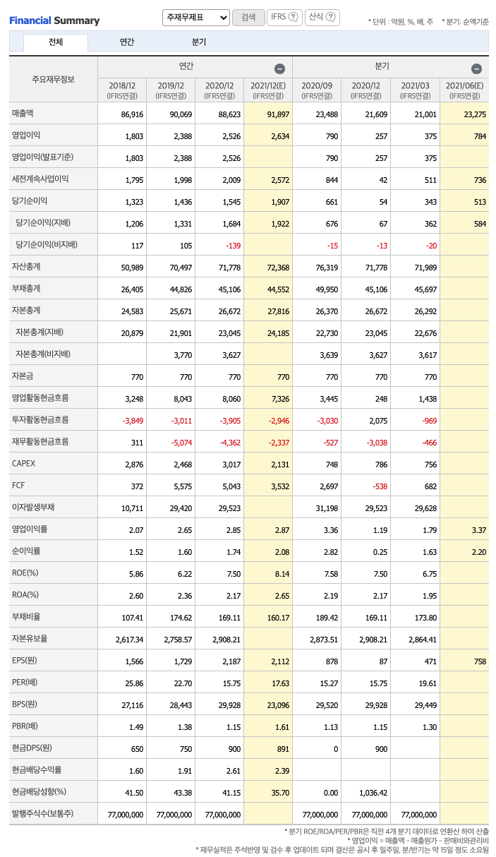 CAPEX(Capital expenditures,자본적 지출,미래의 이윤을 창출하기 위해 지출한 비용을 말함) : 2018년 2876억원, 2019년 2468억원, 2020년 3017억원으로 CAPEX가 좋습니다. 2021년은 2131억원으로 추정됩니다.