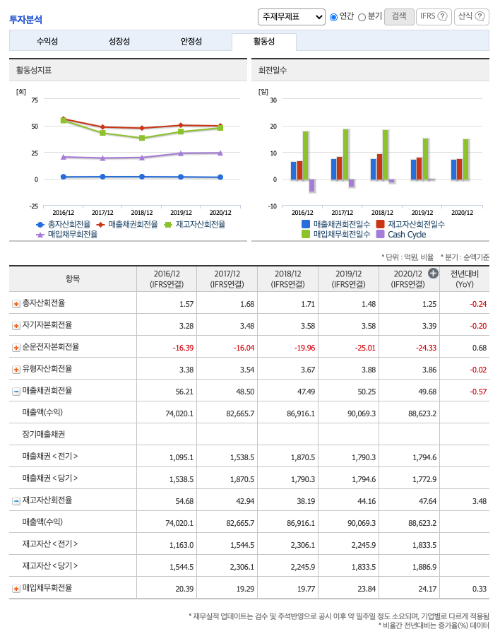 재고자산회전율 : 2018년 약 2245억원, 2019년 약 1833억원, 2020년 약 1886억원이고, 회전율은 2018년 약 38회, 2019년 약 44회, 2020년 약 47회로 안정적입니다.