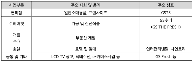 GS 리테일의 주요 사업은 소매유통업으로 편의점 GS25, 수퍼마켓 GS수퍼(GS THE FRESH), 헬스 앤 뷰티 스토어(lalavla) 등을 운영하고 있습니다.