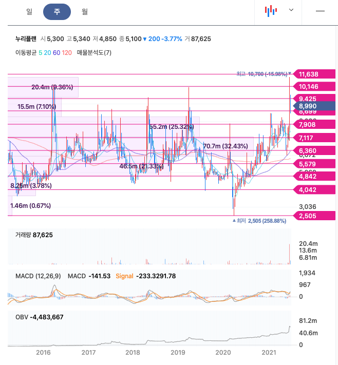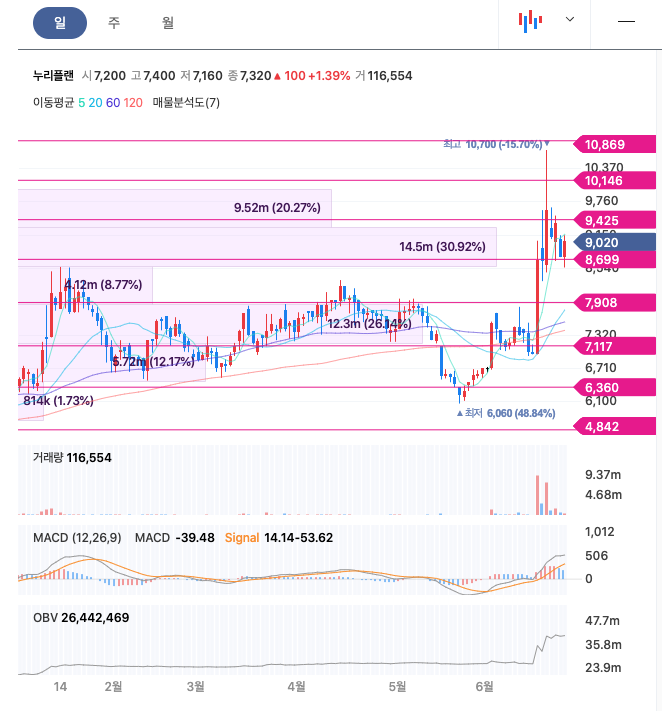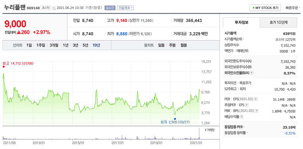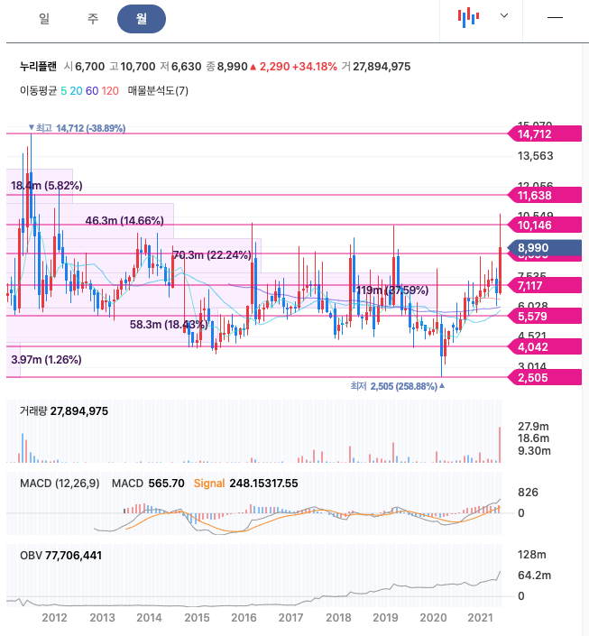 누리플랜은 20년 12월 급등하여 주가가 한층 업그레이드하였고, 이후 21년 5월에 급락하였으나 21년 6월에 급등하여 최고 10,700원을 찍고 조정을 받았습니다.