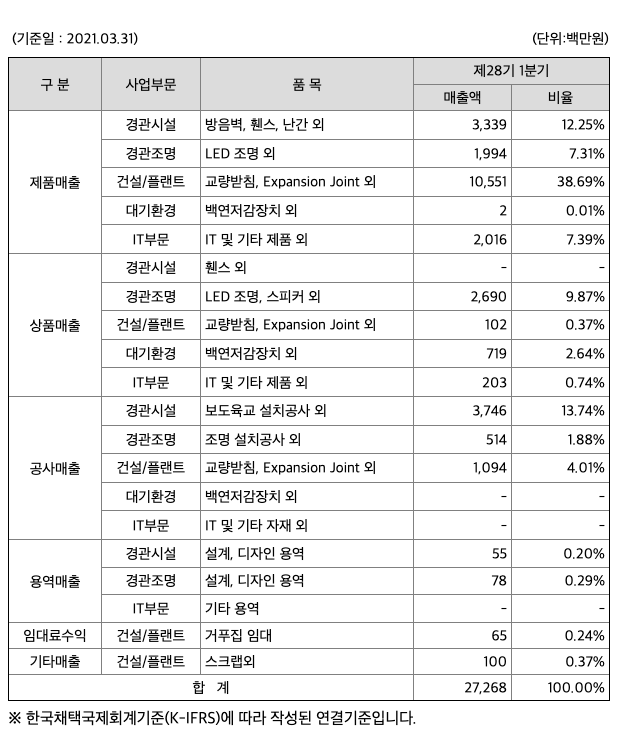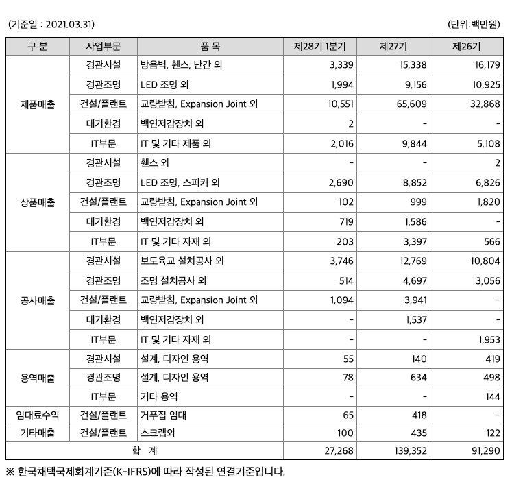 경관시설사업은 교량 및 도로의 일반부대시설물인 난간, 휀스, 차량 방호울타리, 조형물, 외장재, 방음벽 등을 주로 하는 경관시설 부문과 보도육교, 가설교량 등의 철구조물의 시공 등을 주로 하는 강구조물 부문으로 나뉘며 각 부문별 디자인, 설계, 제작, 시공의 일련의 공정을 수행하고 있습니다. 또한, 건축과 토목현장의 분진과 소음 등의 환경적인 피해를 줄일 수 있는 다양한 가설방음벽과 도로, 철도시설 등에서 발생하는 소음을 차단하는 시설방음벽 등을 생산, 제작하는 사업을 포함하고 있습니다. 사업의 성장성은 건설경기 상황에 따라 유동적이지만, 당사의 다양한 아이템 접목으로 발주처의 수요가 증가되는 추세입니다.