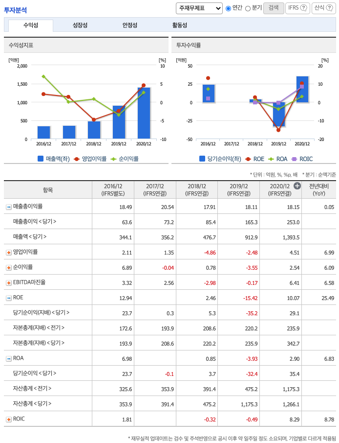ROE(Return On Equity, 자기자본순이익율, 주주의 관점) : 2016년 약 12.94%, 2018년 약 2.46%, 2019년 약 -15.42%, 2020년 약 10.07%으로 증가하였고, 자기자본순이익율은 이상율(10%)보다 높습니다.