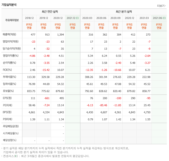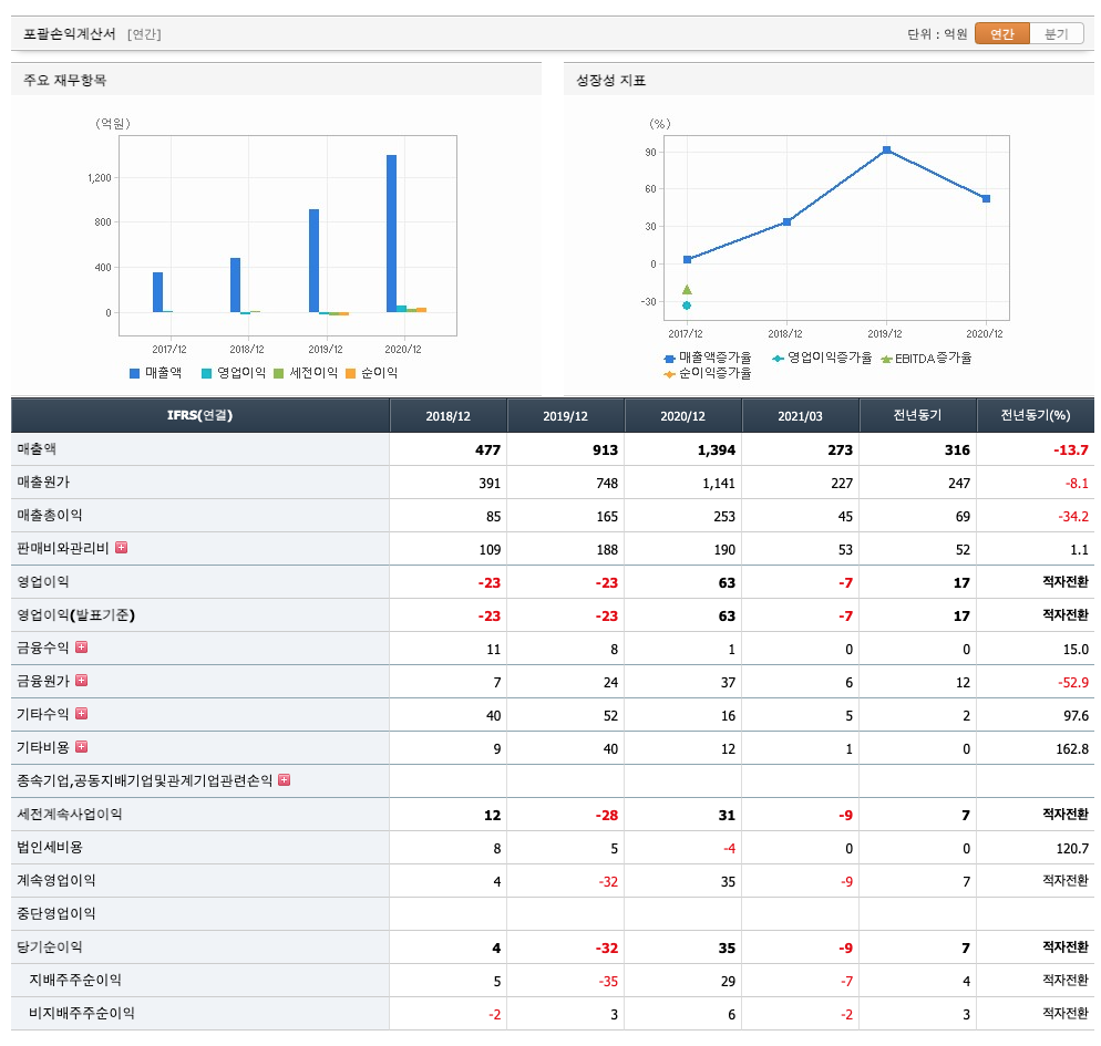 매출액 : 2018년 477억원, 2019년 913억원, 2020년 1394억원으로 증가, 2021년 1분기 273억원으로 전년동기대비 증가하였습니다. 2021년 1분기는 전년동기대비 -13.7% 감소하였습니다. 2020년 분기별로 보면 2분기 -19억원, 3분기 -24억원, 4분기 52억원입니다.