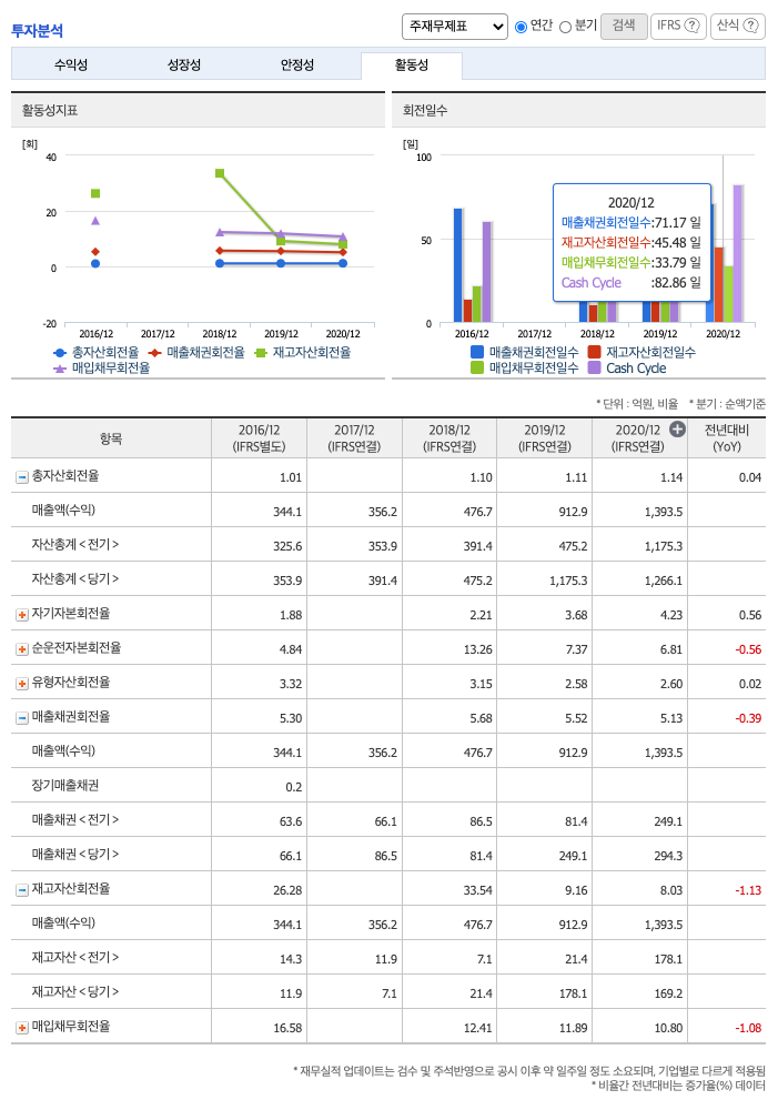 **매출채권회전일수(=돈을 받는 순환일 수, 낮을 수록 좋습니다) 약 71일, 재고자산회전일수(=재고자산 빠지는 일수, 낮을 수록 좋습니다) 약 45일, 매일채무회전일수(=돈을 늦게 줘도 되는 일 수, 높을 수록 좋습니다) 약 33일이고, Cash Cycle(현금회전율, 낮을 수록 좋습니다) 약 82일로 현금운영이 안정적입니다.