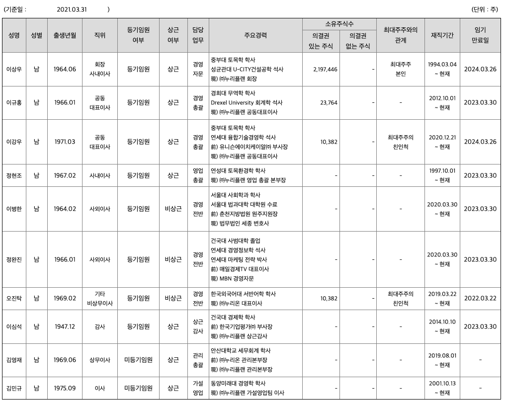 ㈜누리플랜은 경관조명, 경관시설 등의 디자인, 설계, 제조를 주력사업으로 영 위하고 있으며 LED가 내장된 하이테크 접합 유리 스마트 Glass를 개발해 공 공기관 주요 프로젝트에 납품하였습니다. 주요 자회사 ㈜UnisonHKR은 건설/플 랜트, 대기환경 사업을 영위 중이며 세계에서 가장 긴 Causeway Link Project를 수행하면서 레퍼런스를 구축하였습니다. 3Q20 누적 기준 연결 매출 비 중은 경관조명/시설 34%, 건설/플랜트 52%, 대기환경 3%, 기타 11%입니다.