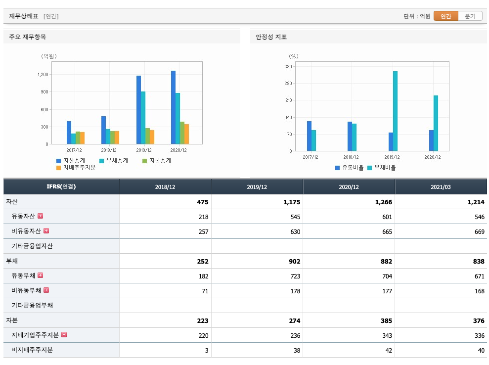 자본은 2018년 223억원, 2019년 274억원, 2020년 385억원으로 증가, 2021년 1분기 376억원으로 감소 하였습니다.