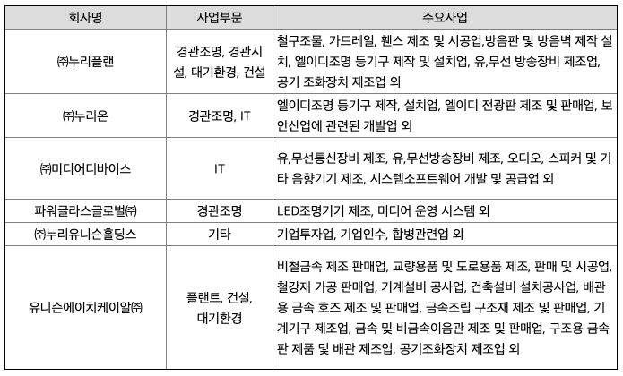 당사의 종속회사인 ㈜누리온은 경기도 안산시에 본사를 두고 있으며, 엘이디 조명 등기구 제작 및 설치업 등을 영위하는 엘이디 조명 전문 제조기업입니다. 주요 제품으로는 실내조명(다운라이트, 직관형 LED램프, LED 주차장등, 평판조명), 산업조명(고출력 LED램프, 공장등, 투광등), 사인조명(사인모듈), 특수조명(고출력 투광등, 방폭등), 암호화 모듈 등을 생산 및 설치하고 있습니다.