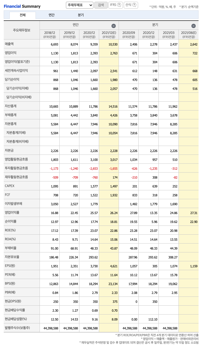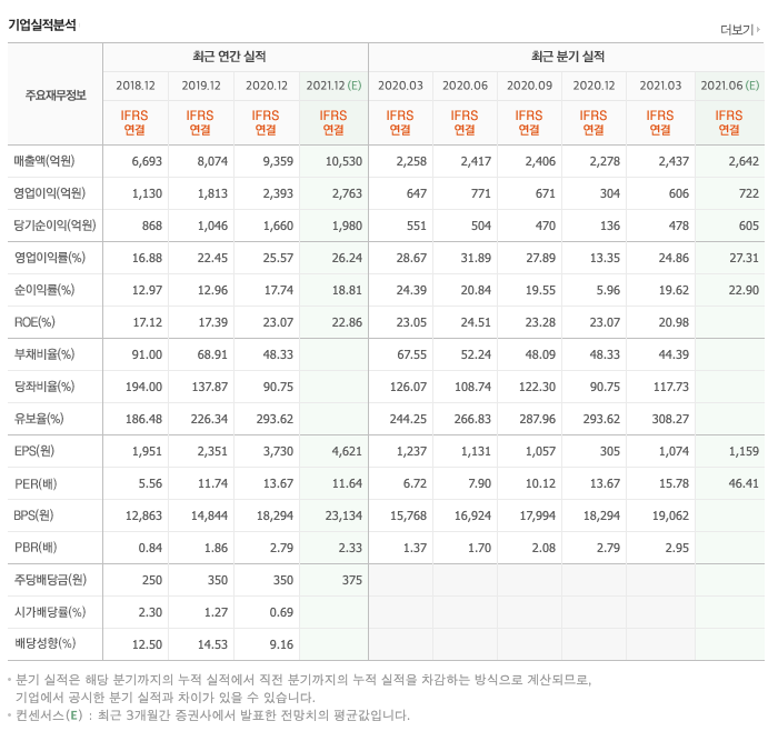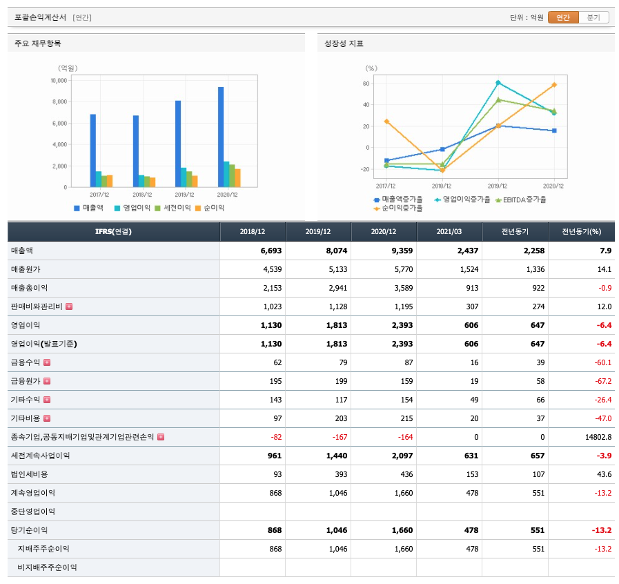 매출액 : 2018년 6693억원, 2019년 8074억원, 2020년 9359억원으로 증가하였고, 2021년 1분기 2437억원으로 전년동기대비 증가하였습니다. 2021년 1분기는 전년동기대비 7.9% 증가하였습니다. 2020년 분기별로 보면 2분기 2417억원, 3분기 2406억원, 4분기 2278억원입니다.