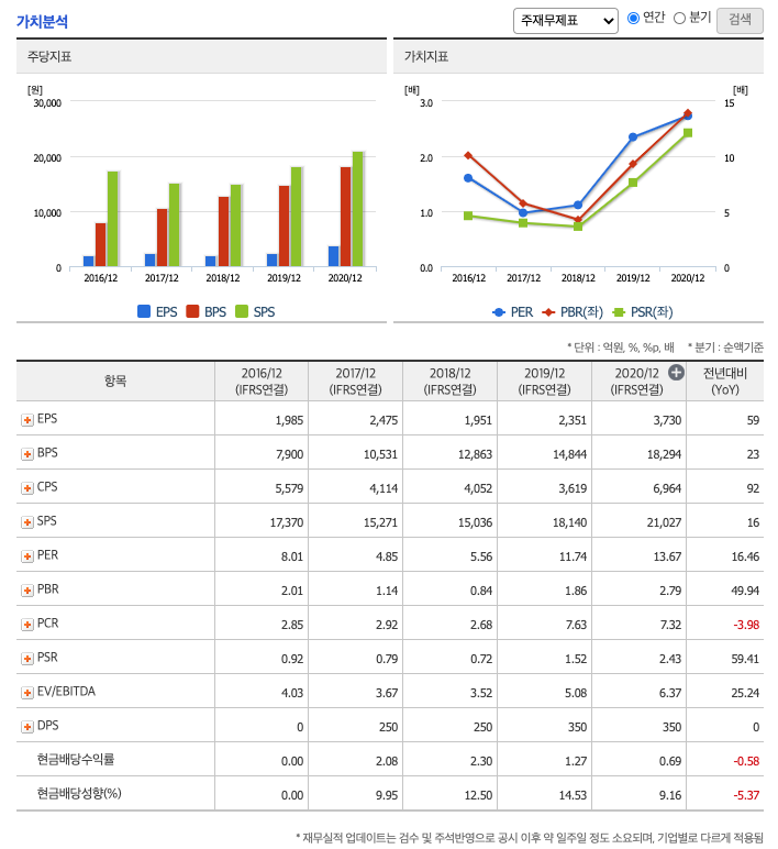FCF(미래현금흐름) : 2018년 708억원, 2019년 720억원, 2020년 1522억원으로 미래현금흐름이 좋습니다. 2021년은 1932억원으로 추정됩니다.