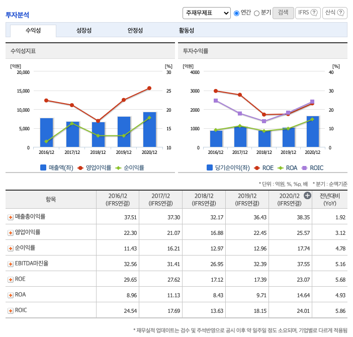 영업이익률 : 2016년 약 22.3%, 2017년 약 21.07%으로 감소, 2018년 약 16.88%으로 감소, 2019년 약 22.45%으로 증가, 2020년 약 25.57%으로 증가하였습니다.