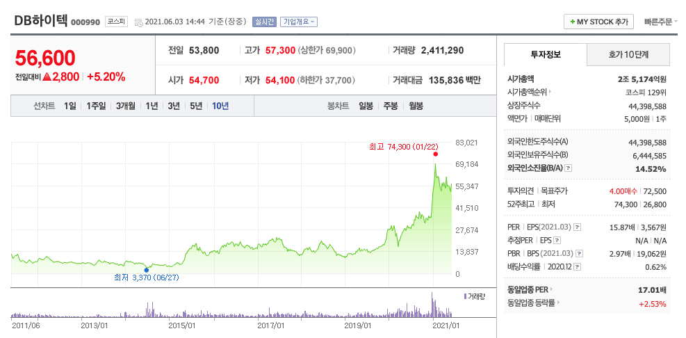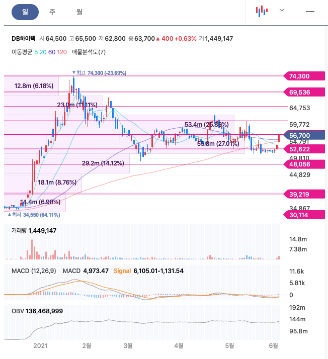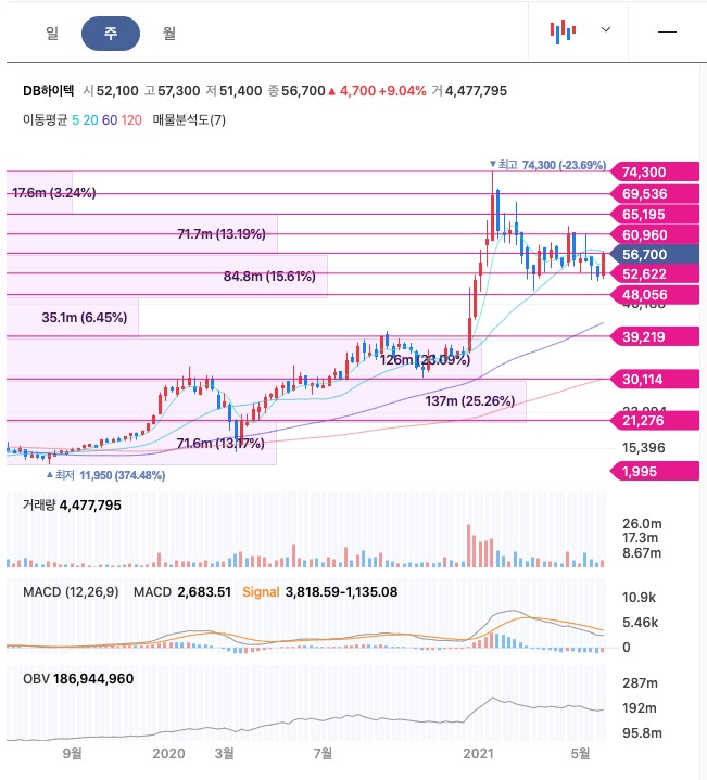 DB하이텍은 20년 12월에 급등하여 21년 1월에 최고점 74,300원을 찍고 조정을 받았고, 다시 반등을 하고 있습니다.