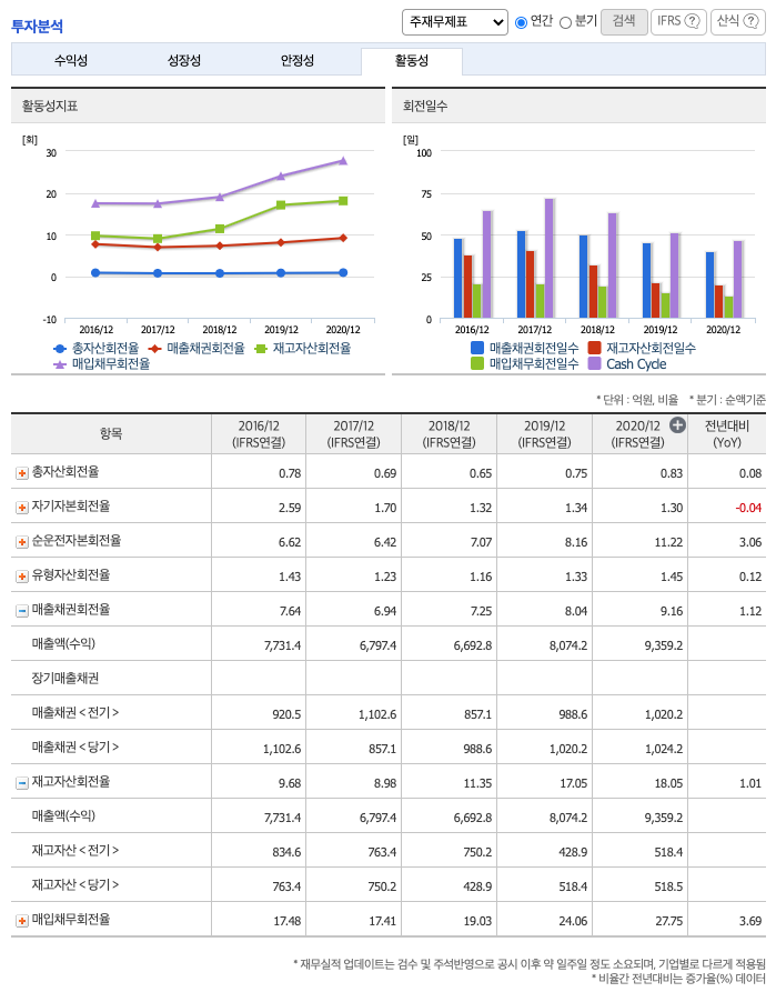 유보율 : 2018년 약 186%, 2019년 약 226%, 2020년 약 293%로 증가하고 있고, 유보율이 낮아 사내 유동자산이 좋지 못합니다.