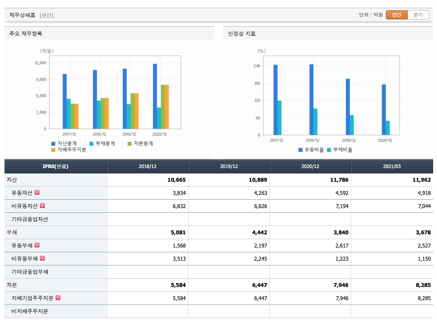 재무활동 현금흐름 : 2018년 -509억원, 2019년 -709억원, 2020년 -760억원, 2021년 1분기 -82억원으로 재무활동 현금흐름이 마이너스로 원활합니다.