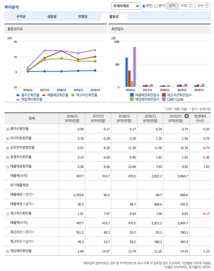 재고자산회전율 : 2018년 55억원, 2019년 780억원, 2020년 967억원이고, 회전율은 2018년 8회, 2019년 7회, 2020년 6회로 안정적입니다.