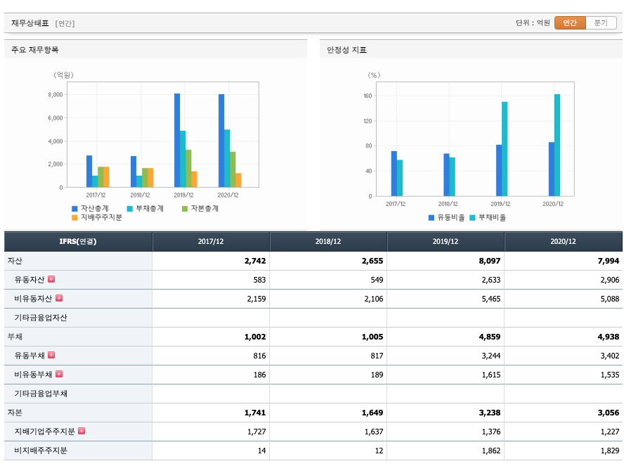 자본은 2017년 1741억원, 2018년 1649억원, 2019년 3211억원으로 증가하였고, 2020년 3056억원으로 감소하였습니다. 자본은 비지배주주지분이 2019년 1835억원으로 전년도 12억보다 급등하였습니다.