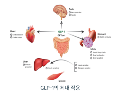 GLP-1 (Glucagon-Like Peptide-1)은 인크레틴 호르몬의 일종으로, 섭취된 음식물의 구성 영양분에 의해 위장관에서 분비되어 췌장에서 혈당치에 의존적으로 인슐린 분비를 촉진하고 글루카곤의 분비를 억제하는 역할을 한다. GLP-1 수용체는 췌장 이외에도 장관, 폐, 신장, 심장, 뇌조직 등에 다양하게 발현된다. 따라서 GLP-1R agonist의 약리 효과로는 혈당 강하 이외에도 위장운동 억제, 내피세포 보호, 심박출 증가, 심장세포 보호, 식욕 억제, 체중 감소, 뇌신경 보호, 골밀도 증가 등이 다양하게 보고되고 있다