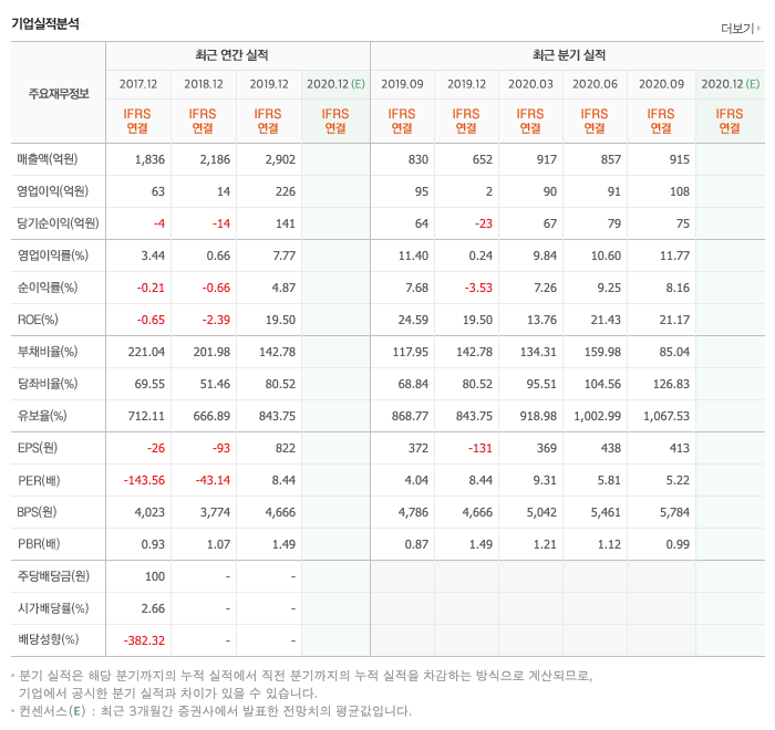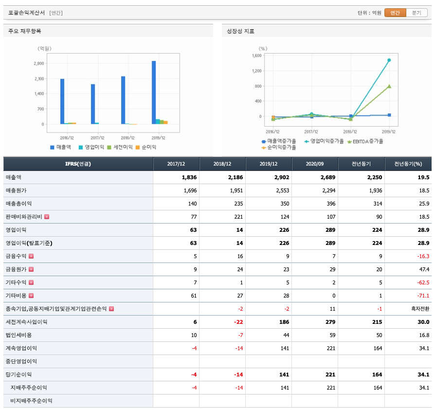매출액 : 2017년 1836억원, 2018년 2186억원, 2019년 2902억원으로 증가하였습니다. 2020년 3분기까지 2689억원으로 전년동기 19.5%증가하였습니다.