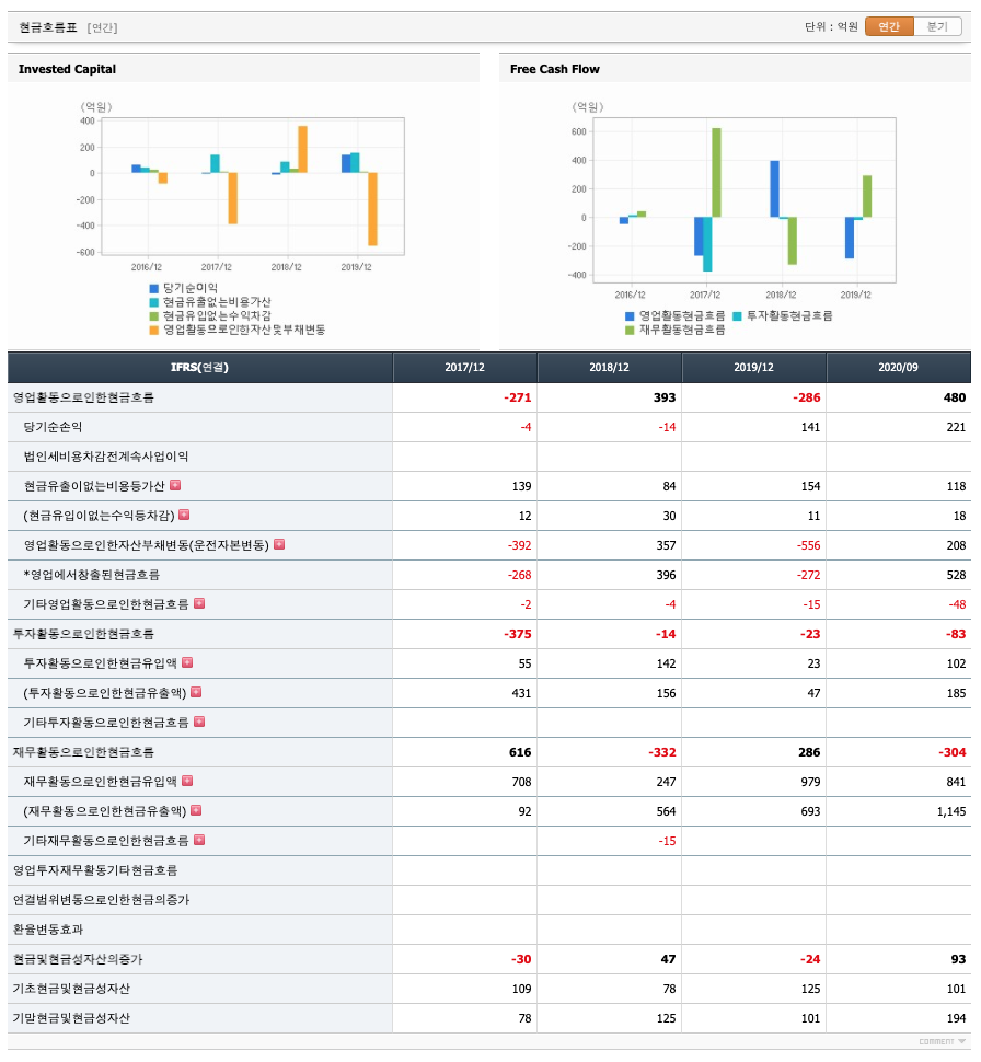 영업활동 현금흐름 : 2017년 -271억원, 2018년 393억원으로 플러스, 2019년 -286억원으로 마이너스였으나 2020년에는 480억원으로 플러스가 되었습니다.