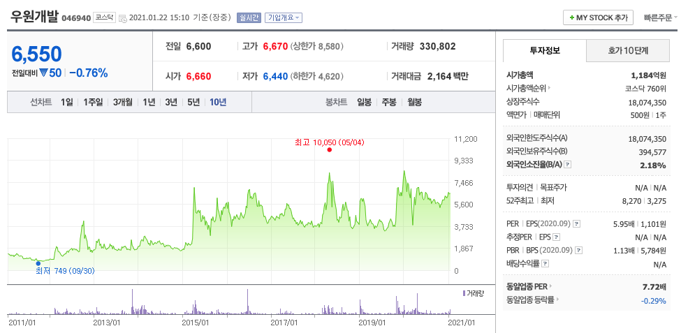 우원개발의 2020년 영업이익은 대략 400억원으로 추정됩니다. 현재(22. 1. 22) 시가총액은 1184억원으로 멀티플3입니다. 여전히 저평가되어 있는 상태입니다.