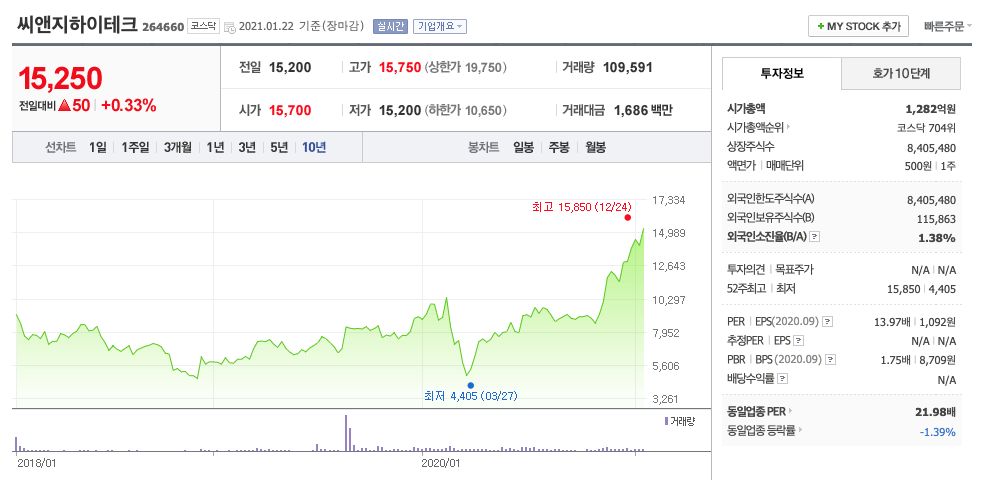 씨앤지하이테크의 2020년 영업이익은 128억원으로 추정됩니다. 현재(21.1.22) 시가총액은 1282억원으로 멀티플10입니다.