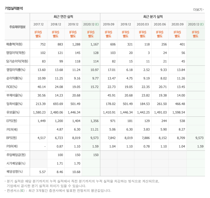 유보율은 2017년 1580%, 2018년 2480%, 2019년 1446% 증감을 오가고 있습니다. 여전히 안정적입니다.