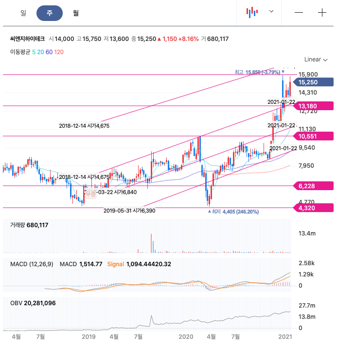 **매매포인트 : 1차저지선 8000원에서 1차저항전 10000원을 횡보하다가 2021년 11월부터 급등하여 1차 저항선을 넘어 신고가를 갱신하였습니다. 앞으로 산업전망과 안정적인 기업운영으로 주가를 더욱 치솟을 것이라 예상됩니다. 매수 적정가는 10000원입니다.